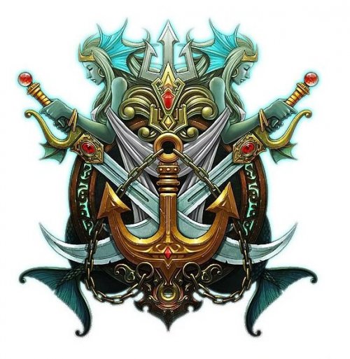 比尔吉沃特的标誌最顶端以象徵海王的权杖「三叉戟」為主轴,左右则是传说中海洋的住民「人鱼」,手握船员最爱使用的弯刀,可以看出比尔吉沃特对海的敬畏,希冀能受到喜怒无常的海洋所庇护;而金黄色的船锚代表著稳定与财富,从繁荣的海上经济来看,比尔吉沃特确实是受到海洋宠爱的城邦。