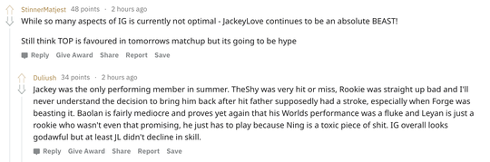 目前IG很多方面都不是最理想状态,但JackeyLove仍然打的像个野兽一样! 虽然我明天还是看好TES,但感觉会是场火星撞地球的比赛。 JackeyLove是队伍里夏季赛唯一表现出色的。TheShy状态不稳;Rookie急转直下,而且我也搞不懂管理层为什么在Rookie的父亲遭遇变故后急急忙忙的把人召回,特别是当时Forge打的好好的情况下;Baolan打的相当平庸,再一次证明了去年世界赛的表现不过是昙花一现;Leyan也仅仅是个尚未让人信服的新秀,但他必须硬着头皮上场因为Ning的事已经是一团乱麻。IG整体看上去相当混乱但至少JKL的技术没有下滑。 我一边想要IG赢,一边又担心他们去了世界赛亲手玷污了去年的神话 我的PTSD要发作了,求求TES阻止IG吧。 - 别担心,就算是TheShy、Rookie和JKL把IG带到世界赛。但凭他们那个送头的野辅,我也不觉得IG能对一支出色的欧洲战队造成威胁。