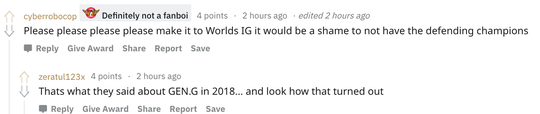 · IG求求你们一定要进世界赛啊,卫冕冠军缺席真的是一大憾事 - 去年你们也是这么说Gen.G的,看看最后成什么样了。 |