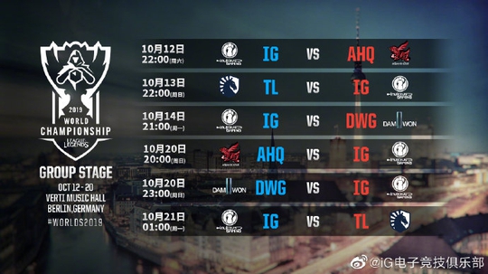 2019英雄联盟全球总决赛小组赛完整赛程出炉,iG战队赛程如下(均为预计北京时间,具体时间以赛程进度为准): 10月12日 22:00 iG vs AHQ 10月13日 22:00 iG vs TL 10月14日 21:00 iG vs DWG 10月20日 20:00 iG vs AHQ 23:00 iG vs DWG 10月21日1:00iG vs TL 新生不息,无惧险阻!向着新的挑战进发!iG加油,LPL加油!