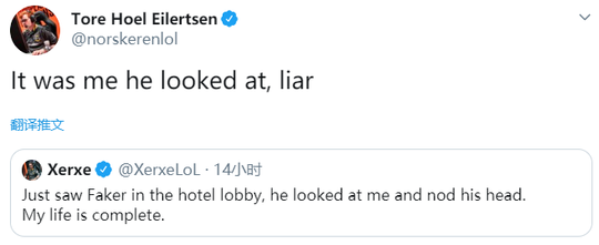 SPY打野Xerxe凌晨更新推特,表示自己看见Faker的激动之情。 “刚刚我在酒店大堂看见Faker,他看着我点了点头,我的人生完整了。”