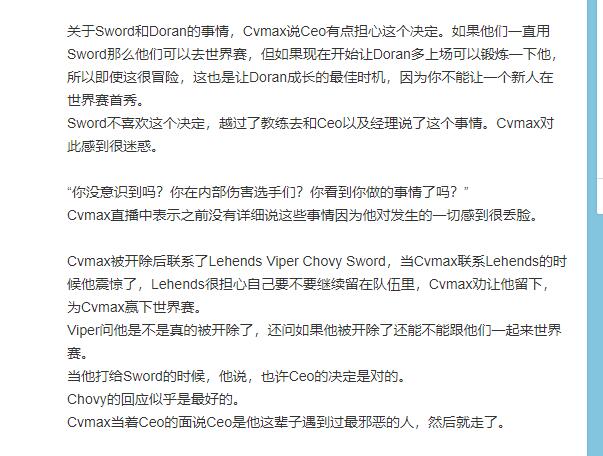 作为世界赛新军的GRF,在首战便被G2轻松挑落马下。当他们好不容易战胜HKA拿下自己的世界赛首胜,粉丝们都以为队伍的情况将要有所好转的时候,队内选手sword和viper却在采访的时候向队伍的前任监督cvmax开炮。两人纷纷表示:请cvmax不要再说和事实无关的话了! 目前并没有加入任何战队专心直播的cvmax,在看到对两位选手的采访之后瞬间崩溃。随即光速开启直播进行爆料,他表示自己和选手们并没有太多的恩怨,主要的问题在于和代表理事赵南奎。Cvmax在队伍输掉春季赛决赛之后和管理层爆发冲突,而赵南奎则是加剧双方冲突的人物。Cvmax爆料称赵南奎为了保住tarzan韩服第一的位置,甚至不惜让其他队员打假赛。 在选手方面,与cvmax存在问题最大的是sword,这位选手因为自己的首发位置被剥夺,直接越过教练去向管理层进行抗议。而cvmax认为,扶正doran是为了让GRF能够获取更多的比赛经验,从而在世界赛上走得更远。 在选手们为cvmax的去留进行表决投票的时候,很明显地分成了三部分。一些人支持赵南奎,另一些人虽然没有表态但是也被迫写下了对于cvmax的负面评价。后续联络选手的时候,只有chovy给到了最好的回应。在离开展对之后,金大湖监督一直在努力维护自己曾经指导过的选手,如今这番彻底撕破脸的爆料,也许是真的忍无可忍了。 目前,GRF内部虽然并没有传出不和谐的声音,但是小编觉得随着cvmax的这波爆料之后,面对外界铺天盖地的议论之声,GRF的队员们是很难置身事外的。从已经进行完的两场小组赛来看,GRF还没有调整到最佳的比赛状态。在此番爆料之后,队员们是会继续团结一致为了冠军而努力,还是会面和心不和早早出局?没人会知道答案,但是可以肯定的是,GRF的冲冠之路,已经蒙上了一层阴影。 那么问题来了,各位召唤师觉得这一次GRF选手和前监督的撕逼,究竟谁才是对的一方呢?欢迎大家在下方的评论区说出你的想法哦! |