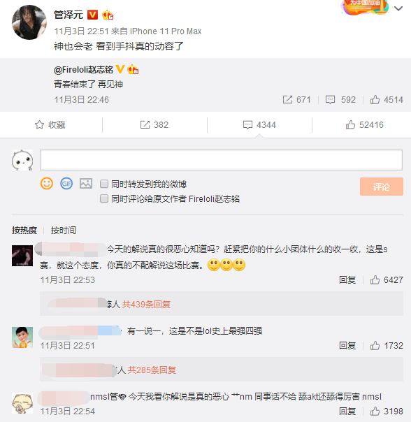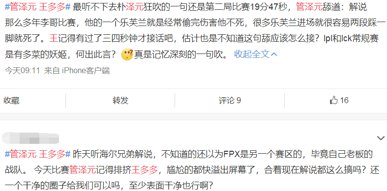 就在SKT惨败G2后,一则奇怪的热搜“管泽元 王多多”占据整个版面排行整整12小时之久,甚至都盖过了Pzi四杀的比赛瞬间。并且在点击进去后,管泽元直接成为LPL解说界的风云人物,遭遇了上万网友的集体爆破,而原因就在于他在直播S9四强赛时强烈的个人倾向,与疑似排挤王多多的行为,引起了大量玩家的不满。 其实这届S9赛上玩家对于解说们不满的情绪,早就从小组开始就弥漫开来了,像是“一笔姐”著名的“妖姬打桩机”“霞自带回复能力”“860块装备打出200块的伤害”的语录就已经被好事者做成了视频集锦。而在四强赛之前,大量女解说也因为游戏理解的问题,被遣送回国,以免将LPL赛区的整体解说抹黑掉。 而在四强赛中,玩家观众对于解说们不满的情形可谓已经达到了顶点。在IG对战FPX比赛时,就有过观众提出解说可以偏袒IG战队,利用解说优势将FPX开除国籍的事件。而在SKT对战G2时,这种愤怒的情绪直接就爆发了出来!管泽元与记得两人不断接话,孤立王多多的行为,直接使得大量网友爆破了管泽元的微博。 网友隔空喊话管泽元:“今天的解说真的很恶心知道吗?赶紧把你的什么小团体什么的收一收,这是S赛,就这个态度,你真的不配解说这场比赛。”“今天我看你解说是真的恶心,同事(王多多)话不给,舔SKT还舔得厉害。”并且质问管泽元“私人恩怨带到工作上来有意思吗?” 虽然随后当事人王多多发布了澄清事实的微博“结束时,记得和管泽元一直给我做手势,希望我能以一句诗渲染,真的很感谢。可我第一时间竟语塞,不知如何形容这种震撼。欲以一身撼天下,须于平地起波澜。”但是网友们依旧没有放过管泽元的意思,认为他没必要太委屈自己,才华横溢总是遭人排挤这种事情十分正常。 客观来说该事件的爆发,管泽元在台上解说的表现绝对是难辞其咎的,但是LPL解说团队是否存在小团队这件事大概率还是被网友们给妖魔化了。 但这也一定程度上说明了目前LPL解说们也遭遇着饭圈文化的冲击,自己在网上构筑人设或是表达情绪时,并没有同步提高自己的业务水平。使得观众们对S9比赛的各个解说都充满了不满的情绪,再加上之前管泽元嘲笑RNG十六强的事件,管泽元遭遇网络暴力自然是不可避免的。 希望LPL的解说们在直播“整活”抢话的同时,平衡好自己对于战队的情绪倾向,并努力提高对于游戏的理解水平,避免类似的事件再度发生吧!小伙伴们对此有什么看法呢?欢迎在下方留言。 |