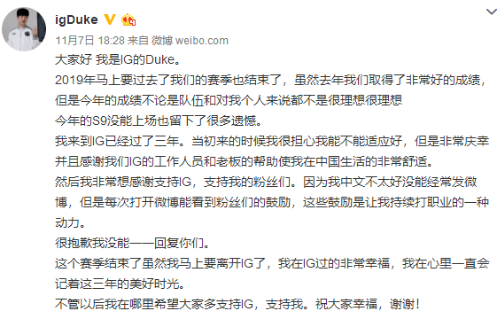 就在11月7日傍晚,两届S赛冠军得主、IG战队的绝对锦鲤、世界顶级上单选手Duke在微博上宣布了自己离队IG的消息。结合之前官方采访中Duke表示IG将会是他职业生涯中效力的最后一支战队来看,此消息的官宣几乎就是等于在宣布自己退役的姿态了。 Duke也在微博中表达了对于IG的工作人员、老板以及粉丝们的感谢。虽然在今年S9比赛上未能上场,战队成绩也不理想给支持者留下了不小的遗憾,但是Duke依然相信IG战队会在未来登峰造极。 不过令人倍感萧瑟的是,在这条Duke官宣离队的微博下方,并没有引起众多LPL大佬的关注。除了IG俱乐部官博发表的感谢外,并无任何一个职业选手或电竞解说在微博评论区表态,这与前段日子omg选手冰封夕阳的退役声明形成了极大的反差。 从战绩上来看,Duke是目前当之无愧的世界第一上单选手,两届S赛冠军加身的荣耀使得他成为了S赛史上最强上单。他离队的消息评论区理应不该如此沉寂的,而IG战队的粉丝们也因为评论区的萧瑟纷纷喊话俱乐部管理层“珍惜眼前人”,不想再看到其他队员离队的消息了。 当然Duke离队所造成的连锁反应并没有大家想象中那么小,居然还牵扯到了LOL一条对于外援的潜规则,那就是各赛区选手本土化的定义。即每个赛区可上场的外援应大于等于2个,并只有当一名外援选手在该赛区效力超4年之后,才能被视为本土选手。而IG战队的The Shy与Rookie皆为韩援选手,Duke效力时间仅为3年,这才是导致Duke常年坐冷板凳的根本原因。 随着S10新赛季的来临,Rookie也将正式成为LPL赛区的本土化选手(2015年注册为LPL选手),随着Duke离队,IG战队也能腾出手来,再次招募一到二名外籍选手备战S10。并且就在两天前,外媒就曝光了有关SPY队伍打野Xerxe欲加入IG战队的消息,看来在S10赛季IG战队有可能会成为LPL史上首个引入欧援的本土战队。 根据S9大赛上Xerxe多次单杀Faker的表现来看,这名19岁小将在打野方面的潜力十分可期。不过假如Duke离队真就是为了Xerxe腾位置的话,宁王又该何去何从呢?欢迎小伙伴们在下方留言。 |