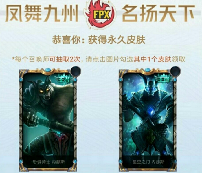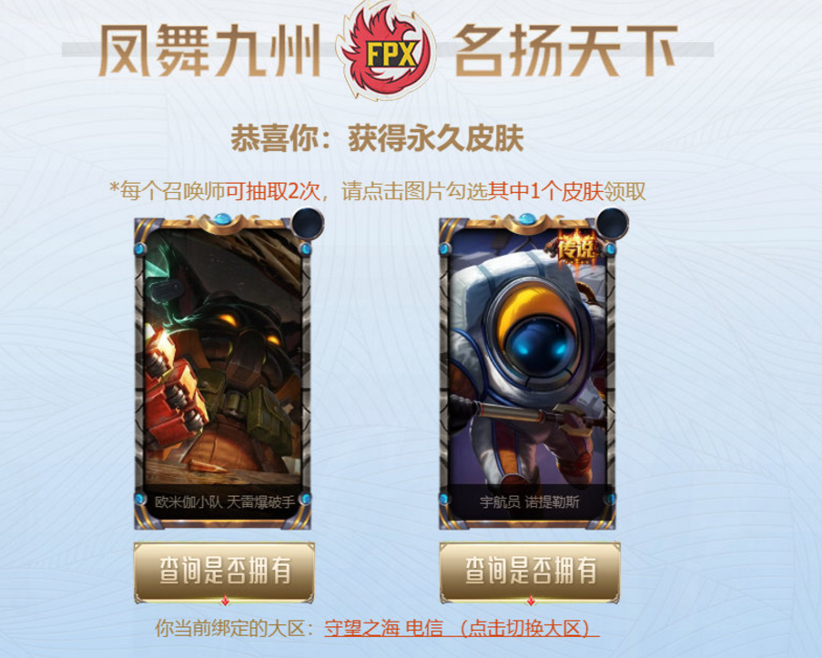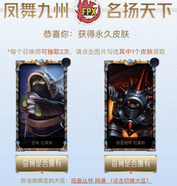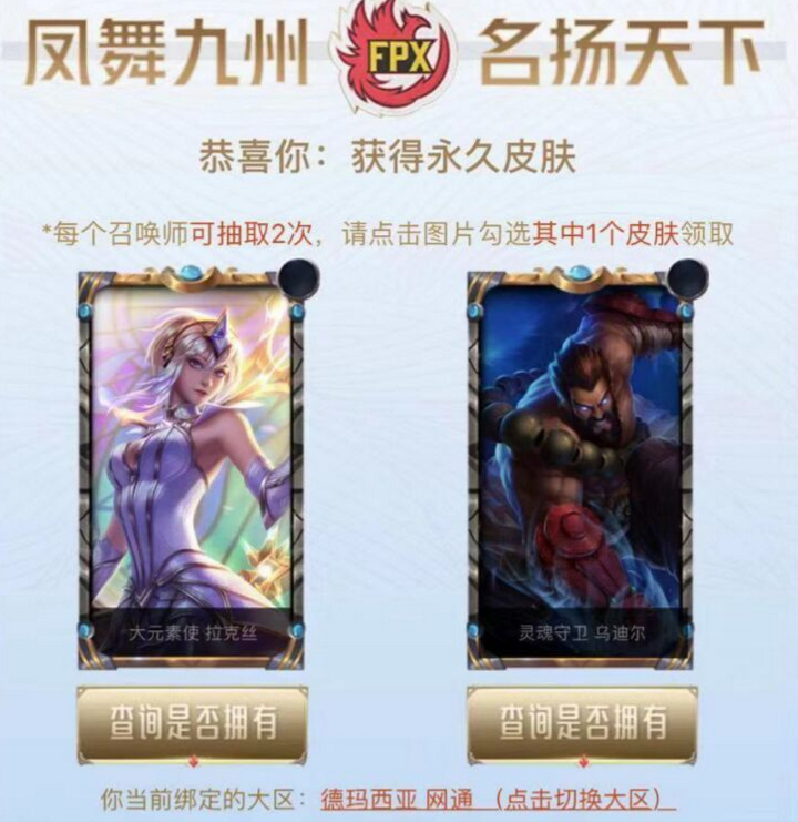 如同去年一样在FPX夺冠S9后,国服在11月15日开启了FPX冠军皮肤宝箱活动,所有LOL玩家均可登录相对应的界面,在奖池中随机抽取两款皮肤,并从两个奖励中任选其一免费领取到自己心仪的大区中。 对于一般性的非洲召唤师而言,双狗头或是双龙龟皮肤可能已经是自己预料之中的非酋运气了。但是在贴吧、微博等各大玩家社区中,今年冠军宝箱中所开出的极品皮肤概率却是十分频繁,甚至达到了人均199的可怕地步! 像是拉克丝的大元素使、乌迪尔的终极皮肤灵魂守卫都能在同一宝箱中出现,也彻底惊呆了小编的24K狗眼,这简直就是在给欧皇玩家送钱啊! 而像是今年皮肤奖池中压轴的赵云子龙、吕布奉先、未来战士伊泽瑞尔等价值199元的皮肤也频频出现在各位召唤师的眼前,一度令人有种过年般的错觉。 而运气差一些的玩家也普遍获得了关羽云长、战场BOSS布里茨、宇航员诺提勒斯等传说品质的皮肤,综合来看这次夺冠活动免费赠送的皮肤质量与出现的频率,都完全碾压了去年IG夺冠S8后的冠军皮肤宝箱,也有比较阴谋论的玩家猜测官方可能在今年上调了极品皮肤出现的概率! 抛开LOL国服官方在去年与IG战队夺冠的纠葛不谈,能够通过这次官方活动,免费获得高质量皮肤对于平民玩家而言还是相当不错的奖励。而大部分LOL玩家的心态也瞬间从一开始的比惨大会转变成为了欧皇的狂欢! 不知道各位小伙伴,你们通过这次的FPX冠军皮肤宝箱开出了怎样的皮肤呢?欢迎留言分享 |