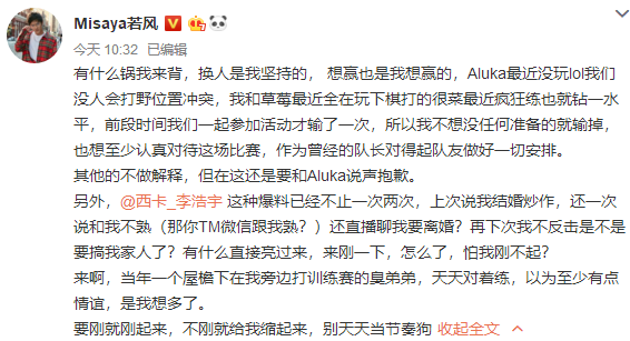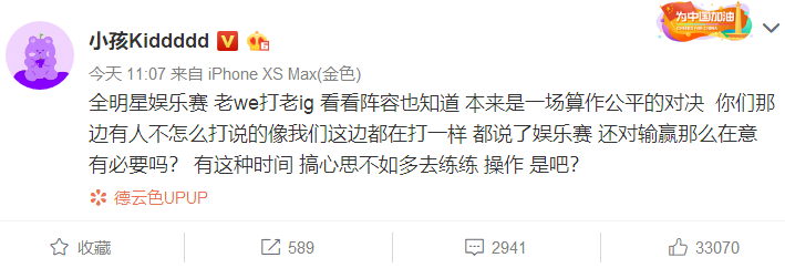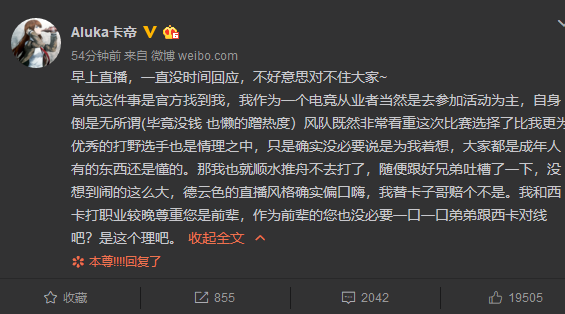 近日,德云社主播西卡在直播时曝光了若风换下阿鲁卡,找到西瓜选手上阵全明星赛的微信聊天语录。其中若风由于冰冷的拒绝态度激起了广大网友的非议,这也导致了若风在上午发博硬刚西卡“带节奏”! 在近日绝地求生比赛结束后,当事人阿鲁卡也正式回应若风,表示自己出战全明星赛的名额是官方给的,而且自己也十分想去打比赛的。当然出于风队对于比赛的看重,自己挑选优秀的打野选手也在情理之中,只是确实没必要说是为我着想。“大家都是成年人,有的东西还是懂的,那我也就顺水推舟不去打了。” 最后阿鲁卡更是力挺了一波自己的好兄弟西卡,表示德云社直播风格就是口嗨,自己跟西卡打职业较晚尊重你是前辈,替卡子哥陪一个不是。但也调侃了若风在该事件中斤斤计较的态度“作为前辈的您也没必要一口一口弟弟跟西卡对线吧?是这个理吧。” 阿鲁卡这次表态显然将矛头再次指向了若风随意换人的行为,而此条微博下方西卡也留言到“阿鲁卡你生病了,我帮你微博找个厉害的去对线,给你先说一下哦!” 不得不说号称“微博王一代目”的若风这次真就踢到了铁板上,本身自己换人的行为就不太光彩,还要非要跟德云社的口嗨节目效果去斤斤计较,结果惹得老IG全队与阿鲁卡本人都不太舒服,小孩Kid也直接开撕若风“有这种时间 搞心思不如多去练练“操作” 是吧?”。 目前若风还未对铺天盖地的负面舆论有所表态,反而是IG全员都已经被激出了血性,看来在全明星赛的中路必会撒下一场血雨腥风。小伙伴们对此怎么看呢? |