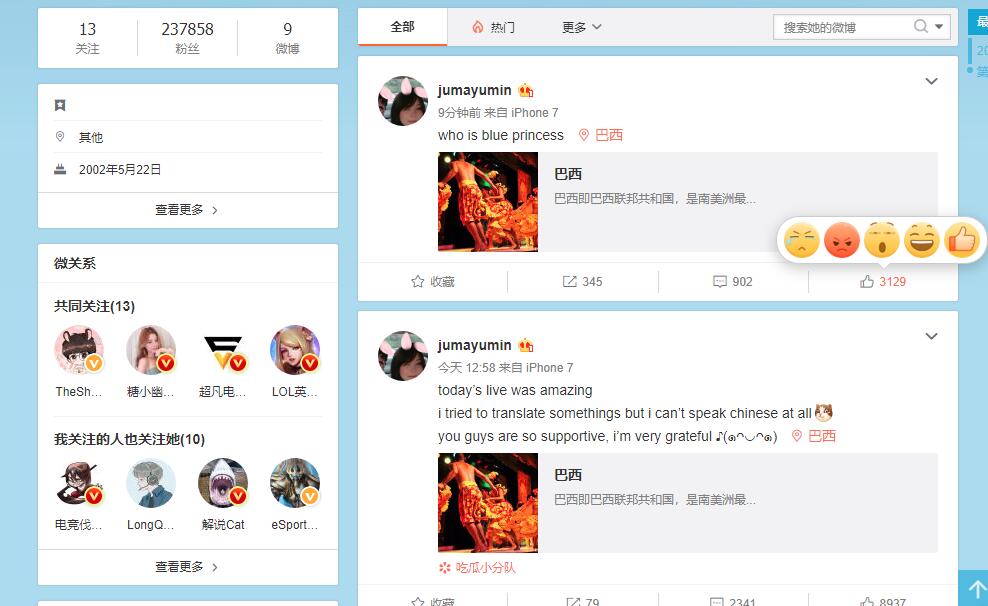 在电竞媒体相继报道了巴西LOL战队INTZ的女辅助选手mayumi的上场消息之后,国内迅速掀起了一阵追捧这位王者女将的风潮。令人没有想到的是,这位小姐姐很快就得知了自己在中国爆火的消息,并且非常迅速地注册了自己的个人微博。不到两天的时间,这位小姐姐已经拥有了23万粉丝,真的是一夜涨粉20万。 mayumi在微博上第一个主动关注的选手,居然是IG战队的辅助宝蓝。仔细想想,mayumi和宝蓝同是辅助位置,而且宝蓝去年也是世界冠军辅助,这种加关注的做法好像也不是特别奇怪。不过,宝蓝的黑粉们显然不会放过这样一个进行“文化输出”的好机会。对于宝蓝在国内的各种黑料,mayumi显然是不太清楚的。她在自己的微博上还发出了“who is blue princess”这样的灵魂拷问。 显然,“蓝公主”这个称谓肯定是宝蓝的黑粉用来带节奏的。小姐姐的中文本身就不太好,遇到这样的陷阱自然也是无法辨别的。幸好有网友进行了提醒,小姐姐也是很快删掉了自己的上一条微博,并且向宝蓝和粉丝们道了歉。 然而令人诧异的是,道歉微博下方的评论区居然是清一色地是宝蓝的黑粉。不得不说,宝蓝的“妈妈粉”已经在电竞圈变成了人人喊打的存在。即使是在和外国选手进行互动的时候,网友们依旧不会忘了攻击和嘲讽宝蓝的妈妈粉。 Mayumi小姐姐自己肯定是不会主动去黑宝蓝的,不得不说黑粉的实力真的是太强了。黑粉们和宝蓝妈妈粉的战斗,究竟什么时候才能结束。 小伙伴们对此怎么看呢?欢迎在下方留言。 |