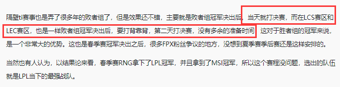在最近,英雄联盟赛事官方公布了LPL夏季赛季后赛的流程图,尽管玩家们早有预期,但依然很难接受对败者组赢面更大的“双败赛制”安排,开始各种怒喷LPL季后赛赛制的不合理之处。那么,问题就来了,使用“双败赛制”的LPL季后赛,究竟是否有着多少含金量呢? 首先为大家解释一波,目前LPL季后赛的赛制规则,除了会按照常规赛排名分为两组之外,在四强赛阶段,每一支落败的队伍都将进入败者组,可以获得一次“复活”的机会。而LPL季后赛的决赛,则是由胜者组冠军跟败者组冠军决一胜负。 这个赛制乍一看没有任何问题,但是在时间安排上却出现了重大失误,因为进入败者组的队伍,能够获得几乎跟胜者组等同的休息时间。换言之,如果队伍实力过强的话,完全可以在四强阶段战略性进入败者组,进而避开跟胜者组的争夺,最后在总决赛现场与没有复活甲的胜者组冠军交锋。 反观胜者组冠军,几乎每一场比赛都得全力以赴,而且在最后决赛阶段,一旦输掉了比赛就没有任何“复活”的机会,可谓是优势全无,而这恰恰就是引起网友争议的核心话题。 那么,双败赛制就无法做到公平公正了吗?有网友表示,隔壁家的DOTA2赛制就更加合理,在败者组决出冠军的当天,或是第二天去开启总决赛,显然能让胜者组在准备时间方面占据优势,更容易让人去信服比赛的含金量,而不是跟LPL季后赛这样,两支队伍在准备一周的情况下,打响总决赛。 说实话,目前LPL季后赛的赛程设置的确存在着问题,胜者组没有足够多的优势去赢下比赛是一方面;在最后决赛时,观众需要等待整整一周的时间去期待,热情很容易就会被消退,则是另一方面,希望官方在后续比赛过程中,能够做出相对应的调整吧。 不知道各位小伙伴,你们对于LPL季后赛的双倍赛制又有何看法呢? |