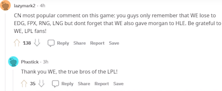 由于是首次使用11.19版本进行世界赛的缘故,在S赛首日就冒出了许多让人大受震撼的骚套路与神操作,也引爆了不少观众的槽点。尤其是HLE战队上单选手摩根(Morgan)的低迷状态,直接让韩国观众将他移除了国籍,深刻地领会到了“此子必不能放回LCK”的管理学威力。 在韩网的赛后讨论中,不少韩国玩家都表示,摩根在S赛中的发挥是毁灭级别的,HLE本来应该要让实力最强的Chovy打上单,然后把摩根摇摆到中单,选个鳄鱼这种英雄抗压就行了,只有让Deft跟Chovy打出线上压制,HLE才有可能赢下LNG战队。 当然了,更多的韩国网友还是激动地表示,直接让摩根离开HLE,脱离韩国国籍似乎是一个更简单的选择。没有任何一个人会想要在世界赛上看到,一个能在打野死命帮忙的情况下,还能让对面上单贾克斯发育起来的内鬼式选手。 相对比韩国观众的阴阳怪气,欧美玩家直接就表达了,他们对LPL上单选手的赞赏:“阿乐给予了其他战队Ban掉贾克斯的理由”,“LNG从头到尾压制住了HLE”,“这就是LPL上单的威力吗?没有一个人可以限制住贾克斯的切入”…… 欧美玩家还提出了一个相当有趣的观点:被提前淘汰的WE战队,才是LPL赛区的最大功臣。这支战队不仅把入场券让给了EDG、FPX、RNG、LNG,还把他们的上单选手摩根送给了HLE。由此看来,LPL赛区为什么强?他们强就强在拥有了WE战队。 此外,不少欧美玩家对于蛮王出现在中单位,与劫出现在打野位的BP感到十分意外,特别是在Chovy逆风开团切后排,还能屡屡开大逃跑的中单蛮王,已成功破坏了部分欧美玩家的观赛体验,让他们发自内心地希望在未来,能够出现大量像LNG这样可以把中单蛮王愉快送走的战队。 单从S赛首日的表现来看,各大赛区的战队水平显然存在着较大的差距,这也导致了比赛节奏偏快,观赛体验十分不错,各位小伙伴可以关注一手。 |