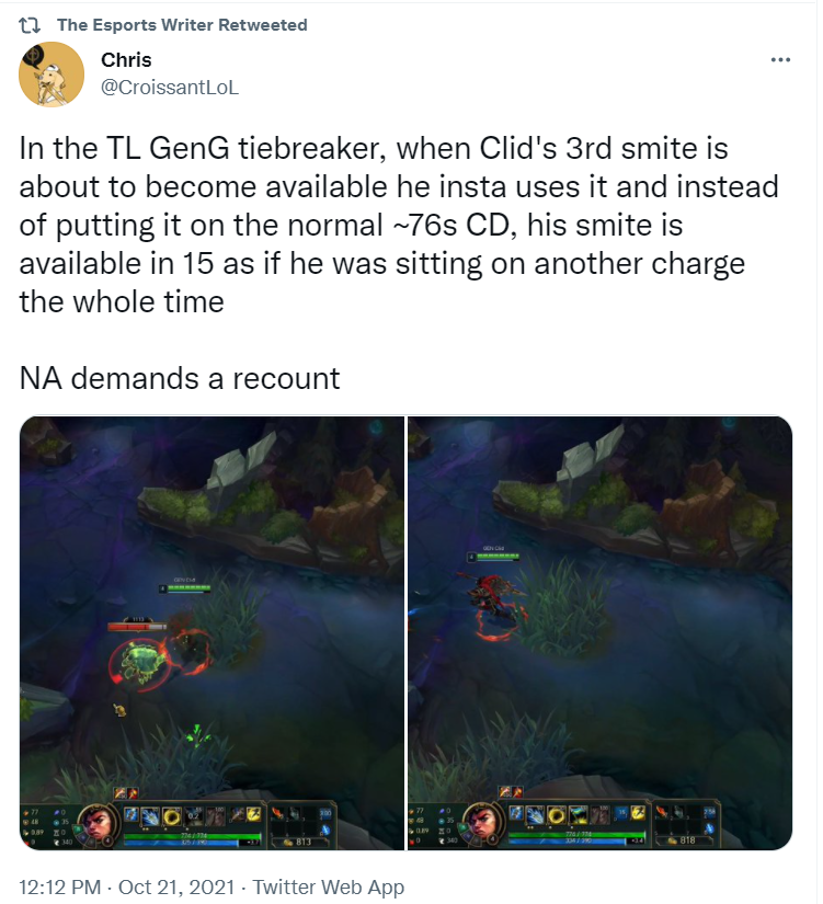 在两天前刚刚结束的S11英雄联盟全球总决赛小组赛赛程中,发生了许多出人意料的事情。观众们先是见证了赛区二号种子FPX被欧美、韩国队伍轮番暴打率先出局,而后又创历史的遭遇了D组四队同分的盛况。 D组的比赛LNG原本距离小组第一出线只差一场,结果却铩羽而归,跟他一起踏上归途的还有北美赛区的代表队TL。可在后续的复盘过程中,有人发现了GEN在和TL的加赛中,出现了严重BUG。 指出这个BUG的人,是LCS二级联赛GG战队的助理教练Croissant,他在复盘这场对局时找到了被所有人忽视的盲点,随后便在推特上发言,称:GEN和TL的比赛中,GEN打野选手Clid的惩戒时间出现了问题。 当时的比赛时间是四分钟,Clid选用的皇子在上半区刷着河蟹。在惩戒恢复之后他交了技能,但技能的冷却CD只有15秒。要知道根据游戏原有的设定,第三个惩戒之后的CD理应为75秒。由于不知名的原因,Cild的召唤师技能缩短了整整一分钟! 关于记对方技能CD这件事,向来非常有梗。远一点的如S8赛季的UZI,他在洞察到pary水银饰带还没转好这个契机,让小虎的蚂蚱和Letme的奥恩打出了完美团战。近一点的Doinb,他在比赛中最常做的事情,就是公屏打字记录对方选手的召唤师技能。 若要问Clid本人是否知道这件事,答案恐怕是肯定的。打野选手们个个堪比“千层饼”,场上的博弈每时每刻都在发生。记录全图的野怪刷新时间、眼位是最基本的,惩戒少用一分钟就冷却好了,不可能发现不了。 Clid的惩戒冷却BUG,虽然并未出现在争夺关键地图资源(大龙、小龙、远古龙)时,但这个惩戒确实加快了他的刷野节奏、BUG也确实存在。作为已经发现的BUG,拳头赛事官方理应做出反应,避免在更重要的对局中出现纰漏。 在推特的最后BUG的发现者Croissant坦言:NA赛区应该对比赛结果重新进行裁定。 如果咱们把自己代入到TL的视角,希望重赛的诉求肯定会更加强烈。可是在八强赛明天就要开打的当口,拳头安排重赛的可能性几乎为零。倘若这个BUG能够在当晚察觉出来,观众们或许能见证第三轮加赛,奈何时过境迁,TL只能自认倒霉剑指S12了。 10月25日也就是下周一,GEN将对上同样来自北美的C9战队。能不能帮NA的兄弟挣回场子,就看这轮BO5的表现了。 那么大家对这件事又有什么看法呢? |