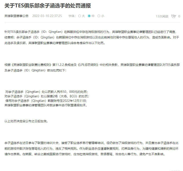 “只有Faker作出的反馈,联盟才会真正重视。” 早在TES上单晴天因为消极比赛引发了Faker的不满时,前C9教练LS就已经预料到了这点。T1战队第一时间向官方反馈了这个问题,而LCK事务局也用最快的速度与LPL赛事官方取得了沟通。于是乎,在晴天昨晚向Faker道歉后不久,今天凌晨LPL就下达了对晴天处罚公告。 晴天只是被封号一年,Faker失去的可是一场Rank啊 官方公告对晴天的具体处罚为: 对余子涵选手(Qingtian)处以罚款人民币50,000元的处罚; 对余子涵选手(Qingtian)处以禁赛2场(大场,BO3)的处罚; 停用对余子涵选手(Qingtian)韩服账号至2022年12月31日; 英雄联盟职业赛事纪律管理团队将就该事件进行联盟通报批评。 看完LPL对晴天的处罚,我的第一反应是:“这未免有些太过了吧?” 不可否认晴天消极比赛的做法有错在先,可5万块的罚款、整个2022年无法使用韩服账号,再加上禁赛两场的处罚(上场机会本来就少),这对选手本人来说影响巨大。要知道Bo当初被扒参与假赛,最终处罚也不过是禁赛4个月。 许多同样认为LPL对晴天的处罚过重的网友,因此发出了调侃:“虽然晴天失去了职业生涯(误),但是我们的Faker失去了一把Rank啊!” 目前,随着晴天的道歉以及处罚公告的发布,这件事算是告一段落了,可是Faker口中:“摆烂的总是LPL选手”却还是表明了问题所在。只要LPL选手还以韩服为主要Rank场地一天,同样的问题就依然可能再度发生,LPL官方理应找到治本的办法。 好了,聊完这个严肃的话题,再让咱们来一起看看轻松点的事件。 兮夜时隔三年帮助WE取胜,腿哥终于能开香槟了 因为OMG全员隔离导致比赛被延期,昨天只有WE对阵IG这一场比赛。本赛季WE的选手迎来了大换血,战绩也一落千丈。常规赛进入尾声,WE仍旧处于全联盟垫底的位置。不过近来随着兮夜回归首发位置,队伍的情况逐渐好转。 在对阵IG的比赛中,作为全联盟年龄最大的中单之一的兮夜拿下了二连MVP并率队取胜。手里捧着香槟等了一个赛季的腿哥957,终于找到了喝它的机会。虽然WE已经提前告别的季后赛,但在换了7套不同的阵容以后WE至少开始赢了。 而这场BO3的胜利对兮夜来说也意义重大,这是他自S9离开WE之后,时隔三年帮助队伍拿下的第一个大场胜利。 值得一提的是WE此前的首发中单Shanks,据传已经开始去其他队伍试训。夏季赛开始时兮夜将在WE稳坐首发,年轻的Shanks则会寻找更适合自己的队伍。代入60E的视角,这或许是最好的结局了。 英雄联盟赛场上,欧洲人的信仰英雄是什么? 日前,在英雄联盟北欧赛区的比赛中,VANIR战队在BP阶段选择了潘森作为辅助英雄,这让他们赢得了满堂喝彩以及解说们的惊呼。一脸络腮胡的解说看到潘森被选下来以后,激动之情溢于言表,好像自己才是斯巴达人。 倒不是说这个英雄有多冷门,毕竟DWG夺冠那年,辅助Beryl差点就选了潘森的冠军皮肤。触发了观众们和解说G点的要素,正是源于他们对兼具史诗色彩和英雄主义元素的斯巴达勇士的喜爱。 英雄联盟游戏运营至今已经11年,159个独特英雄在创作过程中,灵感取材自全球各地不同的文化。“龙的传人”李青是每个中国玩家的心头好;阿狸在韩国玩家们眼中也有着非凡的地位。 当然,亚索才是全世界玩家的终极信仰,如果某一天亚索获得一款冠军皮肤,没人会质疑它的销量。 |