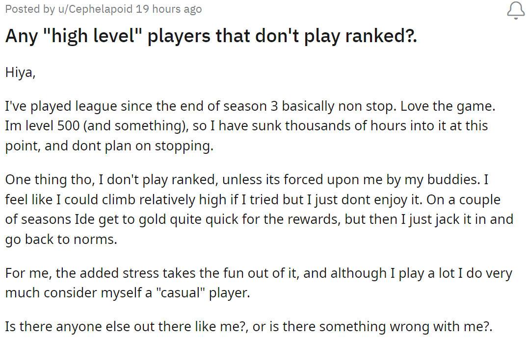 “你白银觉得是我的锅,那就是我的锅,因为白银说的话,就像是一个癌症晚期患者说的话。”因为被弹幕破防,气急败坏的英雄联盟主播电棍,曾说出了这段话。后来一度还被许多玩家,奉之为嘲讽段位低的人的“圣经”。 在英雄联盟这款竞技性极强的游戏中,段位一直是玩家之间衡量对方实力的最主要方法。早年间还没有黑铁段位时,“菜得就像青铜”就是游戏中最侮辱人的话语之一。 不久前英雄联盟官方曾经更新过一份数据,其中统计了各个段位玩家的占比,但不同于以前由“真金白银”所统治的战场,当前人数最多的两个段位已经下沉为“黄铜白银”。 那么有没有不打排位,不追求段位的佛系玩家呢?答案当然是肯定的,并且这部分人还算少。最近在外网Reddit论坛上,就有一位自称玩了几千个小时的游戏,等级高达500级的玩家,寻找起了不打排位的同伴。 据他所说,自己从S3开始就在玩英雄联盟了,并打算继续玩下去。然而排位对他来说,却始终没有什么吸引力。自己每个赛季只会花很少的时间打上黄金,目的只是为了拿到段位奖励,仅此而已。 这个帖子随即引起了不少人的关注和共鸣,这部分玩家认为,游戏应该是给人带来快乐的,但打排位会有压力,只有匹配模式才符合“快乐游戏”的理念。 同样还有人拿Faker举例,称这位英雄联盟电竞赛场上的传奇选手,最开始就是一位只玩匹配的玩家。 尽管这个论调听起来很虚幻,但的的确确是真实的。在正式开启职业生涯以前,Faker曾在很长一段时间里只打排位。直到胜率和隐藏分太高再也匹配不到人,这才开始打排位。随后他就用70%胜率的瑞兹打上了韩服第一,并且玩任何英雄都只使用两套固定的符文。 有趣的是,目前在欧服、韩服、美服等级最高的十个玩家中(人均几千级),不少人从没有打过排位(至少今年没有打过排位)。这些例子,似乎都在说明竞争激烈的排位赛,并不适合那些“骨灰级”玩家。 有的玩家认为只要我不打排位,就不会被定义;也有人觉得大乱斗才是英雄联盟玩家的最终归宿。或许有玩家是因为没有时间研究版本,才选择打娱乐局的。当然,也可能因为年纪大了操作跟不上......总之,能一直保持打排位的习惯的玩家,无不是真正的狠人。 那么大家平时最钟爱的游戏模式是哪一种呢? |