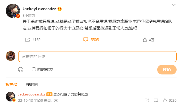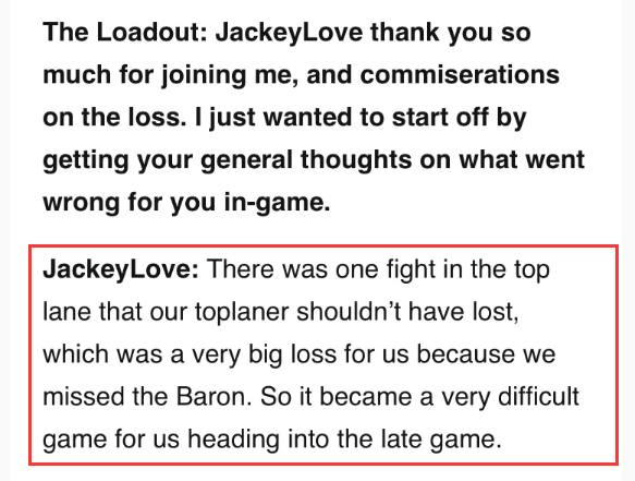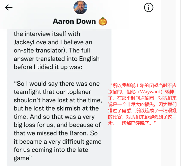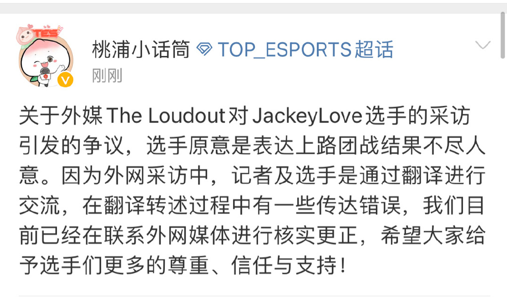 在英雄联盟S12小组赛上,刚刚经历了一波两连败的TES,此时已经有一只脚踏上了悬崖边。如果第二轮还拿不下DRX,那么TES就只能止步16强了。最近这两天,各大英雄联盟论坛都在给TES的选手“分锅”,想要找出在第一轮比赛中问题最大的人。 但未曾想,外媒The Loadout在对TES的下路选手JackeyLove进行采访后,却发出了一段极具争议性的对话内容,这立即吸引了所有人的注意力: Q:“JackeyLove感谢你接受我们的采访,很遗憾你们输掉了和RGE的比赛。我想问一下你认为这场比赛你们出了什么问题?” JackeyLove:“在上路的一波团战,我们的上单不应该这样做。这让我们错过了男爵。所以对于我们来说,这是一场很不寻常的比赛。” 单从这段话,很难不让人觉得JackeyLove是在甩锅上单Wayward。认为正是因为上路打得有些“可惜”,才导致TES没法在接下来掌握大龙。而JackeyLove的这种甩锅行为,后续却遭到了更多人的质疑。因为倘若情况属实的话,他就是在公开指责队友。 随后有网友联系上了当时采访JackeyLove的记者,并询问这条内容的真实性。对方给出的回复是,他的确对JackeyLove的话进行了简化,但传达的意思是没错的。对此,记者还给出了JackeyLove的具体回复内容—— 这位记者还认为,JackeyLove在后面的内容提到TES的整体发挥不好,也只是为了“平衡”。避免将所有的矛盾,集中在Wayward一人身上。也正因为这段采访内容,一些网友还对JackeyLove进行了一轮“火力覆盖”。 随着这起事件的迅速发酵,JackeyLove本人发布了微博进行解释:“关于采访我只想说,菜就是菜了我自知也不会甩锅。我愿意拿职业生涯担保没有甩锅给队友。这种强行扣帽子的行为十分恶心,希望后面能遇到正常人,加油吧。” 不多时,TES的官方运营也下场解释了整件事的始末,强调这是翻译问题。即:JackeyLove表述的是“我们上路的团战没打好”,而非“我们上单没打好”。 如此看来,导致这种情况发生的真正原因,其实是由于采访JackeyLove的记者,是通过另一位英文翻译的嘴来了解对话内容的。“中译英”之后再转译一遍,出现词义上的偏差也并非无法理解。 当前,TES形势虽然非常危急,但很显然还没到放弃的时候。 或许选手们的状态,目前难以达到常规赛时的水准,可不管怎么说,最终还是希望看到作为LPL二号种子的TES,能在16日的比赛中打出韧性成功突围。 那么大家对于此事又有怎样的看法呢? |