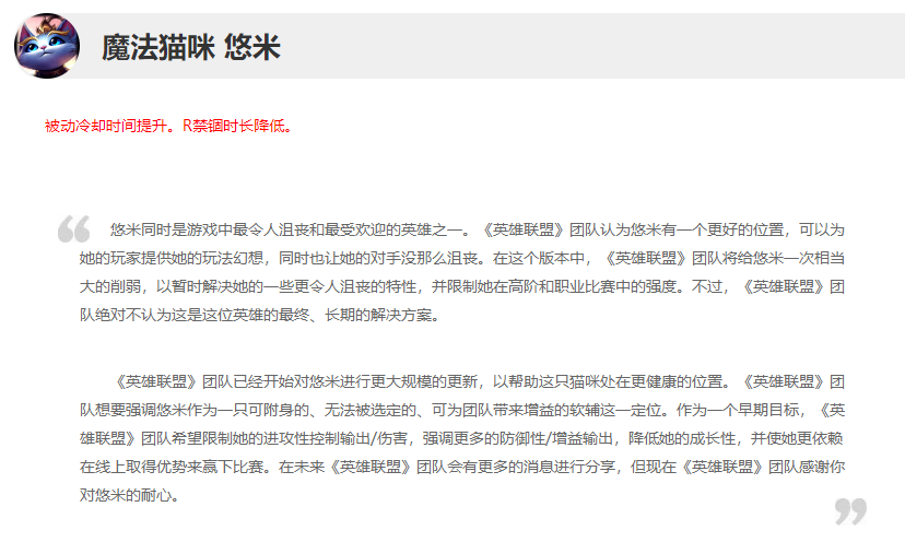 英雄联盟S12赛季即将走向终点,在新的赛年到来之前,各大赛区都在进行着紧张运作。LEC赛区在这个休赛期,都涌现了两支新的队伍;而另一边,刚刚在新队伍拿到大合同的FMVP选手,则还在回味着那梦幻般的总决赛之旅...... 这就让咱们一起来看看,近期LOL圈发生了哪些热点事件吧。 连RGE都卖了?LEC官宣两支新战队 今年的英雄联盟全球总决赛,对欧美赛区的观众来说绝对不算是美好的经历。八强阶段就仅剩一支欧洲队伍了,这个结果显然让人无法接受。休赛期诸多LEC战队都进行了引援交易,也有许多人离开赛场。而在近期,还有两支新的队伍加入了LEC赛区。 今天凌晨,LEC赛事官方宣布了两则重要消息:新的战队KOI、Team Heretics将在新赛季到来时开启自己的首秀,这两支战队将顶替RGE与MSF的名额。 MSF也就是大家俗称的兔子队,早在今年LEC夏季季后赛举办期间,他们就已经被传出会将席位转手。但RGE把队名“丢了”,却是大家都未曾设想过的情景。毕竟在S12赛季,他们可是整个欧美赛区走得最远的队伍。 根据官方公告,取代RGE的KOI战队留下了S12赛季的基本阵容,仅有VIT战队的青训Szygenda顶替了原本的上单Odoamne这一个变动。 而取代MSF战队的Team Heretics,则进行了较大的人员轮换。目前确定的首发人选,只有日本上单Evi(厄加特绝活哥)以及韩国中单Ruby(曾效力于RW)。 新赛季的LEC赛区,除了战队席位发生变动之外,赛制也发生了较大的更改。更密集的赛程与赛事强度,或许能让咱们在S13赛季,看到一个拥有跟原先不一样风气的LEC。 Kingen默认剑魔被Ban,但T1非要送波大的? 距离英雄联盟S12全球总决赛的落幕已经过去多日,但以四号种子夺冠的DRX,一路走来的励志故事依然为玩家们所乐道。尽管五名DRX的选手没能继续当队友,但都因为冠军Buff的加持拿到了大合同。加入HLE的FMVP上单Kingen,也收获了前所未有的关注度。 最近在接受韩国日报采访时,Kingen回忆起了本届世界赛的历程。对于DRX在决赛舞台上的致胜之匙,Kingen聊到了剑魔这个英雄: “我本预测应该不会有玩剑魔的机会,T1在打JDG时ban掉了剑魔,我觉得他们在决赛也会如此,所以我在决赛前十天都没有练过剑魔。” 最终,这个“遗漏”的BP成为了T1的梦魇。Kingen把握住了机会,成就了自己与战队。要知道,外界对DRX的不信任、不看好贯穿始终。然而在面对T1的最强点Zeus时,Kingen扛下来了。并成为了整轮系列赛,发挥最好的DRX选手。 跟S7世界赛的加里奥、MSI季中赛的格温一样,至今大家仍不知道T1为什么没有Ban剑魔,或许“能够处理这个英雄”,才是英雄联盟赛场上最大的错觉。 调整最热门的辅助!悠米大削提上日程 能给队友回血、能消耗对手、能施加护盾效果、能提供团控,最重要的是自己还能在没有“生命危险”的情况下作战。集上述优点于一身的悠米,现已成为最受队友欢迎/最被对手讨厌的辅助。超高的登场率和Ban率,使得设计师不得不对其动刀。 日前,LOL国服官方发布了13.1版本更新公告,其中提到了悠米即将迎来大削:被动冷却时间提升,R禁锢市场降低。 不过上述提到的内容只是调整方向之一,设计师的最终目的,还是为了“限制她的进攻性控制输出/伤害,强调更多的防御性/增益输出,降低她的成长性,并使她更依赖在线上取得优势来赢下比赛。” 数值的调整幅度,会与悠米在新版本的上场率直接挂钩。不过更多玩家还是认为,悠米上身后就不会受到任何伤害的设定,还是有些太难反制了。倘若真想实现平衡,设计师应该从这方面入手。 那么大家觉得,如何调整才能让悠米有个合理的强度呢? |