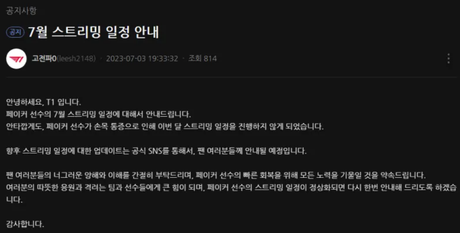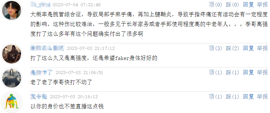 作为电竞活化石般的存在,Faker这位选手自出道以来,除了被教练“安排”在替补席上就没有缺席过一次正式赛事,他的敬业精神与对电竞的热爱,是很多职业选手无法媲美的。但在最近的比赛过程中,由于自己发挥不佳开始频繁地“找理由”了? 在T1与NS的比赛过程中,一向发挥稳定的Faker遭遇FIESTA对位单杀,还交出了一个颇有争议的死亡闪现,看呆了很多网友。好在上单Zeus的纳尔够顶,在中期团战打出了如来神掌一拍四的操作,成功逆转了T1前期不利的局势。 到了赛后采访级阶段,Faker也是首次给自己的失误“找”了个理由,称他的受伤实在太过严重,正在接受治疗,所以在操作发挥上出现了很大的问题,也让队伍的BP比较难做。 随后T1俱乐部立马发出了一份公告,Faker由于手腕疼痛问题将会停止7月的一切直播,后续恢复直播的时间也无法确定,我们正在为Faker选手的伤病而竭尽全力。 从T1发出来的公告信息所示,Faker目前的手伤问题确实蛮严重的,连医生也判断不了何时能恢复。其实不管是英雄联盟,还是其它电竞项目,职业选手因为长期使用鼠标,对手腕损耗是很大的,电竞史上也曾有不少选手因为手腕问题而做手术。希望Faker能早点康复重返赛场,继续他的电竞追梦之路。 对于这次Faker手腕疼痛问题,很多网友也是表示十分敬佩:“打了这么久又是高强度,还是希望faker身体好好的”,“喷过技术和操作,但职业态度没的黑,祝早日康复”,“好好养伤,亚运会大飞老师可不能缺席啊”…… 顺带一提,369也是因为手伤退出了亚运会的选手名单,看来大家还是注意多多保养自己的身体。 |
