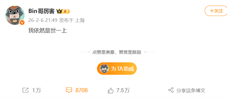 2月6日晚,因中单Knight与辅助ON的糟糕发挥,BLG以1-2不敌AL。原本赛后舆论都在指责Knight这么多年没练出一个沙皇,以及ON依旧没改掉有优势就浪、就送人头的坏习惯。可谁也没有想到,上单选手Bin突然发了一条名为“我依然是世一上”的微博,直接引来百万关注、超7.5万点赞,上万转发。 光是这一条微博就引来LPL职业圈的集体地震,Knight评论“看你表演”,管泽元跟帖“快说你被盗号了我求你了”,西卡点赞“相信你,先锋赛让黑子闭嘴”。 同时,Uzi、Letme、姿态等LOL大主播都直播围观了这个微博,皆表示这个操作神了,Bin哥真帅,绝对是在帮队友吸引火力,他太伟大了! 由于这件事实在是太离谱了,外媒纷纷转发了这个言论,称Bin在输比赛的情况下,依旧坚持自己是世一上,惹来无数外国网友的调侃。 很多网友都觉得这条言论怕不是Bin被黑客盗号了,已经超出正常职业选手能发挥出的极限了,如果是赢了比赛这么说还情有可原,但输了比赛这么说,就不理解了;也有人觉得不论Bin的游戏操作水平如何,他耍脾气的水准绝对是世界第一,太帅了! 各大论坛也讨论了这个事情,他们觉得Bin现在就是个慕容复,只能靠着家传武功欺负下二三流选手,一遇到高手就不行了,还要说自己世界第一。 顺带一提,根据OBGG显示,从1月16日到2月6日打比赛之前,Bin都没去韩服打过排位,而BLG的其他选手包括替补上单、主教练、分析师在内,均坚持日常的排位训练。这种与团队格格不入的训练态度,也让很多吃瓜网友猜测,是否BLG真出现了内部危机。 总之,还是希望Bin可以调整心态,趁着过年期间迎头赶上。毕竟目前版本上单的话语权很大,对于这样一位以操作出名的选手来说,他完全可以靠着对线打出优势,来证明自己的实力,而不是发发微博就算了。 |