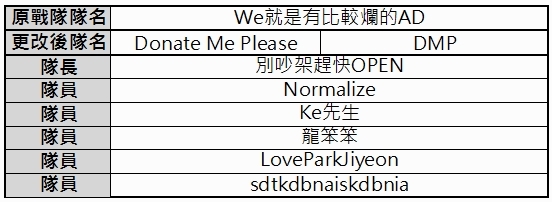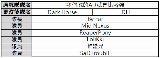 前言: 近日台湾LMS赛区夏季升降赛将会打响,让我们来看看这些奇葩的战队名吧。 As(assassin sniper 刺客狙击手)---原队名:秋季杯文化缺一你来吗 UAH(U are handsome guys 你们是帅哥)---原队名:打打看看打打 YF(Young and Fearless 年轻无畏)---原队名:打歪你们这群小屁孩 DMP(Donate Me Please 请资助我)---原队名:We就是有比较烂的AD 好狂妄的战队名,试问WE的AD不是曾经的世界第一AD么? EXP(Experience 经验)---原队名:经验不等于技术 队员ID也是很奇葩,颇有点少儿不宜。 DH(Dark Horse 黑马)---原队名:我们队的AD就是比较强 看来队内的AD是老大哥咯! KRT(KartRiderTeam 跑跑卡丁车)---原队名:我爱熊熊 我想问熊熊是谁?一群爱卡丁车的熊孩子跟她什么关系?
