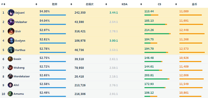 美服韩服5.8版本更新后,胜率排行榜再次发生了小幅度的变化。在近期的比赛中出场的英雄也是越来越多,下面让我们一起来看看5.8版本的数据吧。 ![]() 从韩服的胜率榜中不难看出发育型中单的法坦依然强势,蚂蚱在榜单横行了好久好久,乌鸦和死歌也在榜单安营扎寨,这三位英雄在让我眼前一亮之后,依然在胜率榜上占有一席之地。 这三位英雄在前期有着不错的对线能力,即使在线上打不出大优势,至少也会五五开,在中后期装备基本成型的时候简直就是噩梦一样的存在,有控制技能,自身装备的选择和技能的特性也使他们在团战中站得住,站得住自然能够打出足够的输出。 ![]() 韩服胜率排行榜