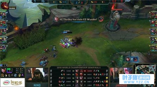 在BP第二阶段中,G2战队更是作出了最愚蠢的决策,禁掉了卢锡安和卡莎,他们决定针对Jackeylove到底,在八强赛中已经证明了下路ADC打出再打的优势也无法决定胜利。G2战队这个BP失误导致杰斯再度被放出来,他们又再面临一个难题,亚托克斯肯定又会被杰斯打爆。为了解决失误导致的这个难题,G2战队将亚托克斯交给上单选手Wunder使用,等于牺牲了最强的上路。 事实上,选择了亚托克斯对阵杰斯确实很难,但打野如果多加照顾的话也不是打不了,Jankos的酒桶前期来上路抓死杰斯一次,但自己失误被Ning蹲草丛击杀。Jankos就有些心态爆炸,在杰斯没有闪现、上路没有视野、Theshy无限压线的情况下,他一次上路都没有来过,最终导致亚托克斯被杰斯单杀。中期Perkz又被Ning抓死,这局游戏又是没有悬念,只是从一个中路无解肥的杰斯变成了上路无解肥的杰斯。