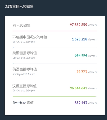 英雄联盟S1全球总决赛只有五支欧美战队参加,冠军得主是FNC战队,而在去年的世界赛FNC也打进了仁川的决赛。而不同的是冠军得主变成了IG战队。 而要说哪一届世界赛办的最轰轰烈烈我想很多玩家都会说是S7的全球总决赛。 作为英雄联盟玩家遥遥领先其他地区的LPL赛区,在中国举办的S赛的热度可想而知。 在北京鸟巢举办的S7全球总决赛,观看直播的中国玩家高达9634万人,占总观看比赛人数的98.4%。