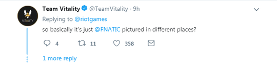 从图中可以看到2011年与2018年全球总决赛的赛事热度对比图。S1时期的英雄联盟刚刚起步,狭窄的空间,简陋的场地与设备加上寥寥无几的观众,而第一届世界赛就是以这种方式开幕。 再到仁川2018全球总决赛的盛大场景,英雄联盟经历了八年的成长,不得不说拳头这波光阴晒的掀起太多回忆。 而VIT战队也评论道:所以基本上他只是FNC在不同地方的合照?