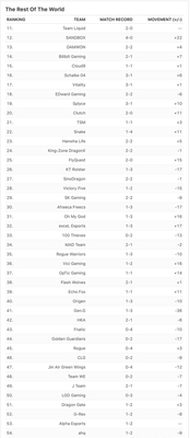 可以看到很多LCK的队伍都在11名之外,而NA赛区现在的头名TL也仅仅只有11名,不知道对于这份排名大家怎么看? |