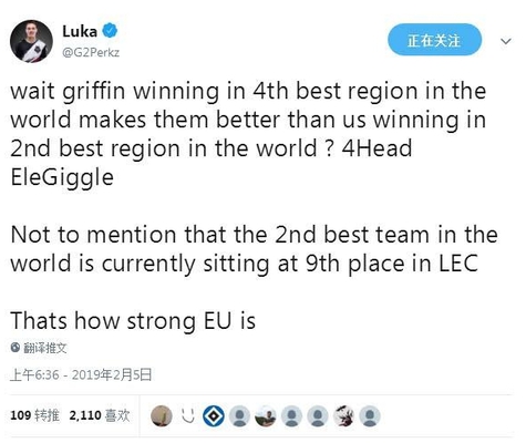 6. JD Gaming 7. G2 Esports 8. SK Telecom T1 9. Royal Never Give Up 10. Misfits 在后五名的排名中,SKT位列第8,虽说之前输给了SBG和GRF,但今年的SKT在实力上确实要比去年强上很多,去年ESPN每次将SKT排在20名甚至更远,看着就让人很心痛,G2能排到第七确实让人没想到,不过Perkz在今天自己的个人推特却吐槽道: