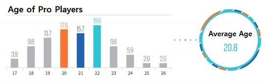 不过位于电竞产业最中心位置的依然是英雄联盟。英雄联盟是电竞领域当中投入资金最多的项目,而LCK也是世界范围内顶级的著名联赛。根据一项在2018年对LCK选手的调查数据显示,LCK选手的平均工资大约是1.75亿韩元(约等于105万人民币)。不过,顶级职业选手的工资水平比平均值有着很大的提升;超过半数的职业选手年薪不到一亿韩元(约60万人民币)。37.2%的选手收入在2000万到5000万韩元之间(约12万人民币-30万人民币),而5000万到一亿韩元(约30万-60万人民币)这个范围也占了选手总数的25.6%。 不过职业选手除了固定工资职业也有不少的收入。2017年的一份数据显示,在所有的职业选手中,只有8.9%是没有工资之外的收入的。很多职业选手每年在工资之外还能够获得约2000万到2亿韩元(约12万-120万人民币)不等的收入。 工资之外的收入主要来源是奖金,个人直播,转播以及赛事活动。不过相比于其他渠道,拥有个人赞助的职业选手数量却相当少,只有8.9%而已。虽然像阿迪达斯和耐克这样的品牌会和传统体育选手签约,但在电竞领域却没有太多这样的例子。我们可以预测,由于电竞行业与职业行业的不断发展,2018年选手的平均收入只会更高。 LCK选手的平均年龄——20.8岁 LCK的职业选手都非常年轻。根据2017年的统计,选手的平均年龄为20.8岁。其中22岁的选手占19.6%而20岁的选手占17.6%。相比之下,达到23岁的职业选手只有9.8%。大家都知道25岁左右时职业选手的技术水平会有明显的退步;2017年时,30岁左右的职业选手是不存在的。