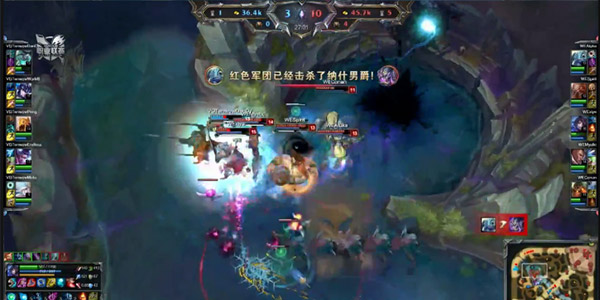 小龙的生死大权一直都在WE手中,在拿下第四条小龙之后,WE想rush大龙,虽然小鱼人传送过来点掉大龙,但是WE团战已经无人能挡,拥有大龙buff的VG也完全不是WE的对手,最后WE成功地扳回一城。