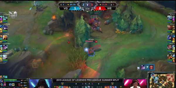 在掌控了场上节奏之后WE之后没有停下进攻的步伐,不断地入侵VG的野区压缩VG的活动空间,而VG这套四保一阵容在前期没有与WE证明争夺,前三条龙都拱手相让给WE,WE也深知VG阵容的特性,所以在不断地寻找开团的机会,VG虽然一直在猥琐发育但是WE借着自己的阵容优势不断地找到机会,卢锡安的发育非常的好,在团战当中无人能挡,WE手握大优势。