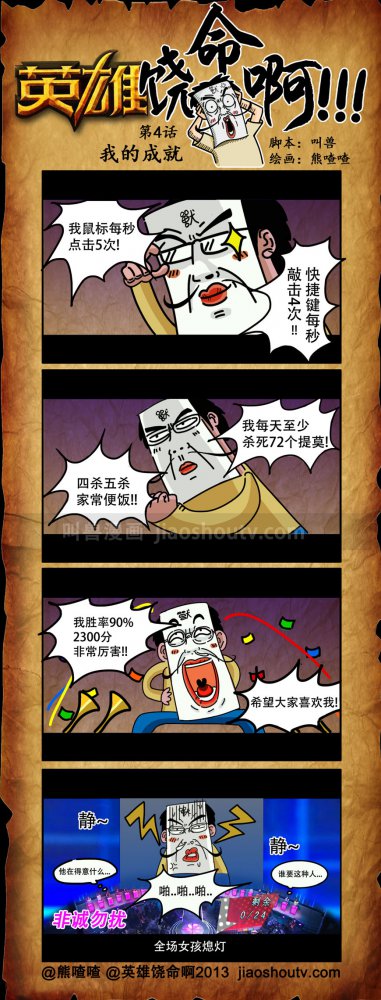 叫兽在LOL包括坑、被坑中的成长经历中创作出了英雄联盟主题系列漫画《英雄饶命啊!》,献给全天下的lol玩家。本漫画是叫兽在游戏中常用来恐吓对手的口头禅为例,当然绝对没有什么不要脸和羞羞的画面出现的,呵呵~