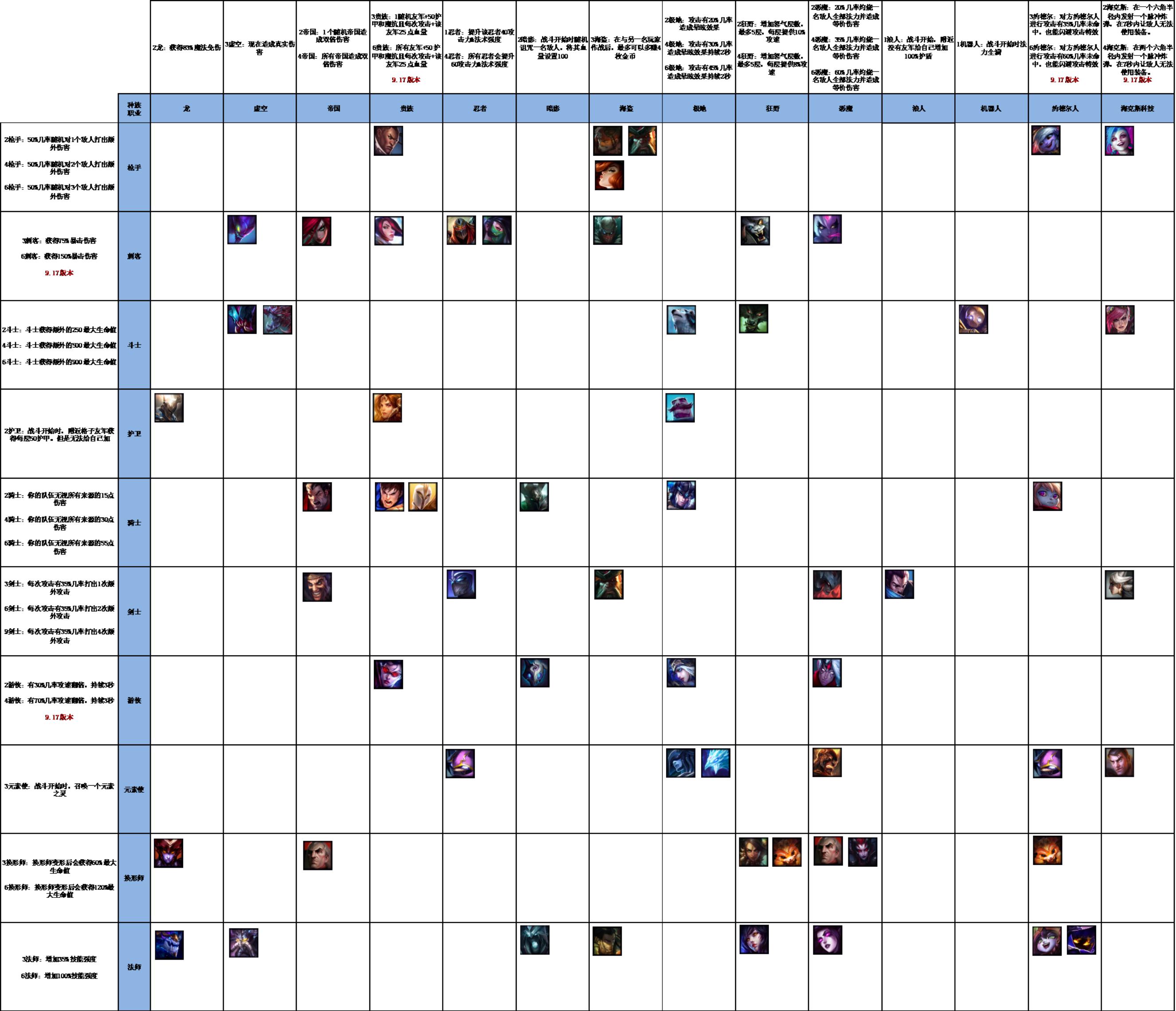 新人怎么熟悉云顶之弈的英雄?当你进入游戏之后就无法回头看英雄的属性和羁绊效果了,新人可能就不知道怎么搭配英雄了。下面小编我做了一个云顶之弈英雄图标,备注了英雄的职业和种族效果,大家保存了等战局开始后再看就省的打开网页查询了。 这个帖子会定期更新。欢迎大家转载分享。 本文由云顶之弈叶子猪专区lol.yzz.cn/ydzy制作,转载请注明出处与作者。 9.17版本更新